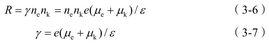 该式是流向一个电子的空穴电流密度,因此单位时间单位体积内复合的电子空穴对的数目,即激子数 R ,应等于 n e / e 。如定义复合系数为 γ ,则有