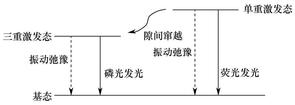载流子复合以后,会因为电子自旋方式的不同而形成两种激发态:一种是由非自旋对称的基态电子形成的单重激发态,能以荧光的形式释放出能量回到基态;另一种是由自旋对称的基态电子形成的三重激发态,通常不能以荧光的形式释放能量回到基态。单重态激子和三重态激子同时产生,根据理论预计和实验验证,单重态激子和三重态激子比例大概约为1∶3,即形成的激子中只有大约25%是可以用来发射荧光的,剩下的75%只能非辐射跃迁回基态。因此,充分开发利用三重态激子,减少非辐射跃迁是OLED研发的重要方向。