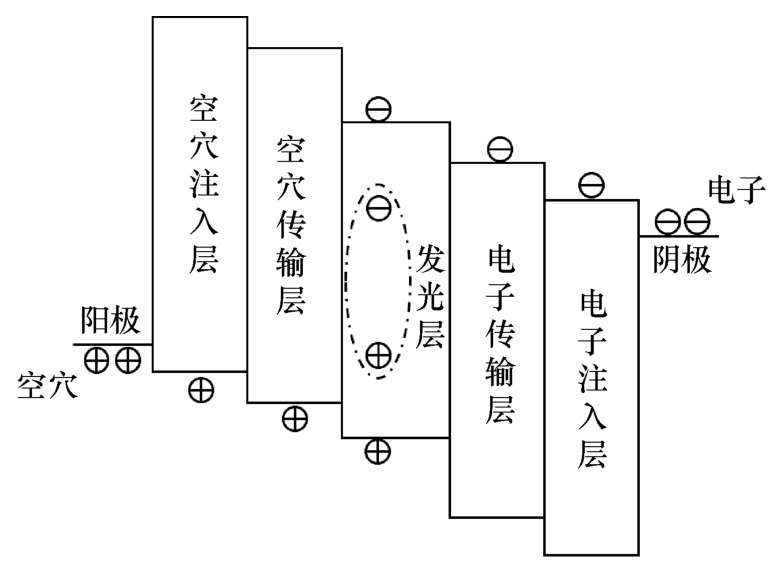在电场作用下,电子和空穴分别从阴极和阳极进入紧靠电极的有机功能薄膜层。载流子注入是载流子通过电极/有机层界面从电极进入有机半导体层的过程,这个过程对器件的启亮电压、发光效率和工作寿命具有直接影响。