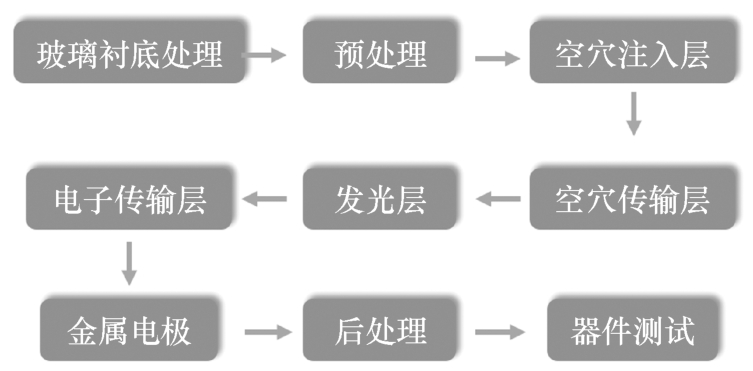 有机小分子OELD一般采用真空热蒸镀的方法进行制备,此类器件(以PMOLED为例)的阳极通常是采用ITO或FTO导电玻璃,其制备流程如下。