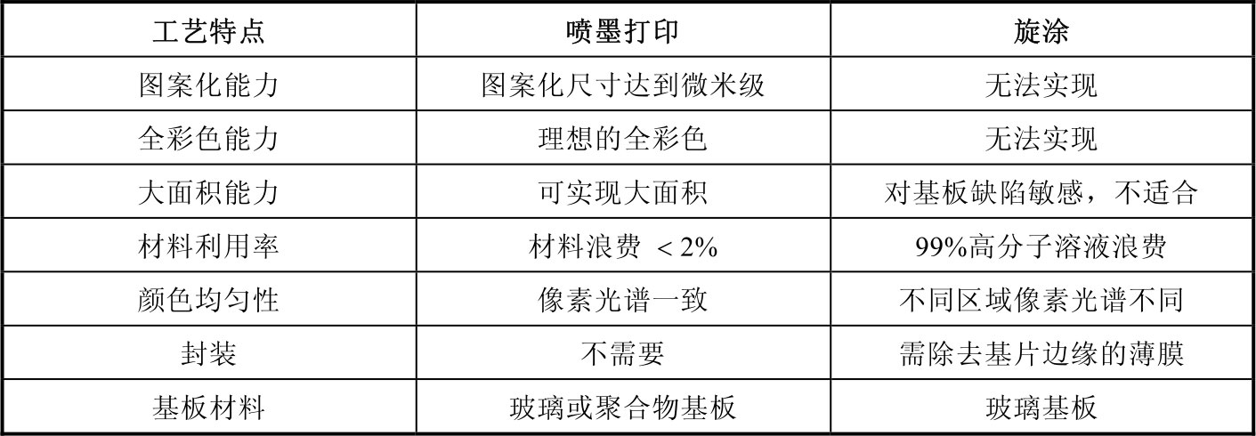 表3-1 喷墨打印和旋涂在PLED制备中性能比较
