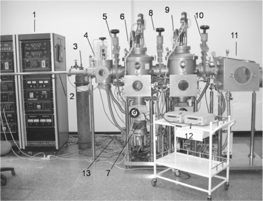 1—仪器控制台;2—传送杆;3—氧气储气罐;4—离子轰击室;5、8、10—挡板阀;6—有机薄膜蒸镀腔;7—涡轮分子泵;9—金属薄膜蒸镀腔;11—器件封装室;12—膜厚动态监控仪;13—机械泵。