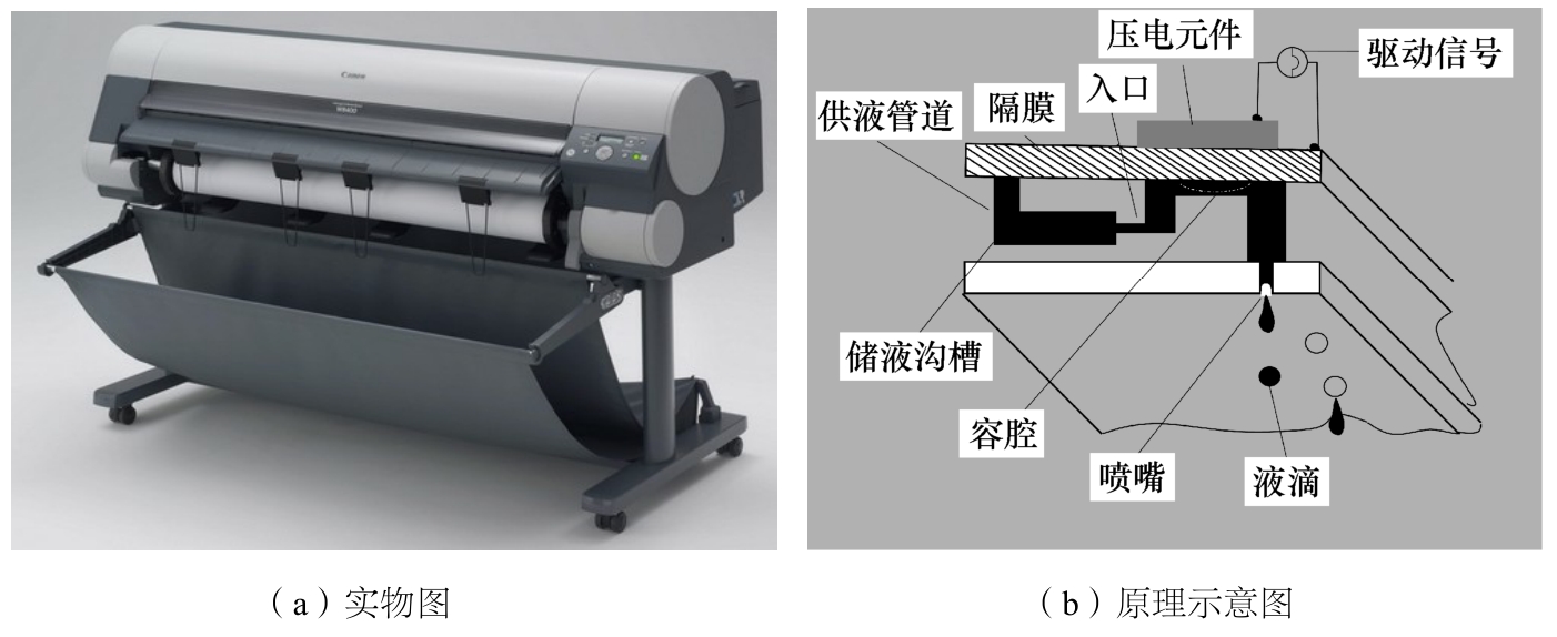 与旋涂工艺相比,喷墨打印技术可以大大提高材料的使用效率。通过预先的设计,智能化制造出各种图案、形状,实现全彩色打印。这种技术更适合发展大尺寸的显示器,两者的具体比较见表3-1。喷墨打印是一种非接触、无压力、无印版的印刷技术,预先将各种不同的功能材料制成墨水灌装到墨盒,通过计算机将图文信息转化为数字脉冲信号,然后控制喷嘴移动和墨滴形成,并利用外力将墨滴从喷嘴挤出,墨滴喷射沉积到相应位置形成所需图案,实现精确、定量、定位沉积。喷墨打印设备如图3-15所示。总而言之,喷墨打印技术的优点是无压力,可以在不同材质、机械强度的介质上成像;非接触,可以在曲面上成像。1998年,美国UCLA的Yang教授课题组首先提出喷墨打印方式是实现制造全彩色高分子发光器件的可行性,并首次用此方法制备出了聚合物发光器件。目前,喷墨打印成为制备PLED的新型方法和研发方向,具备实现全彩PLED量产技术的潜力。