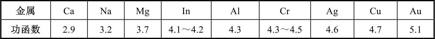 (1)单层金属阴极。一般低功函数的金属都可以用于阴极材料,如Li、Mg、Ca、Al、In等,其中最常用的是Al,主要是因为Al性能稳定且价格适中。但在聚合物OLED中,常用Ca作为阴极,这是因为多数聚合物比小分子电子传输材料的电子亲和势低。表4-2列出了几种常用金属的功函数。