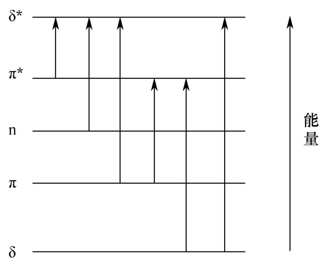当两个原子的P轨道从垂直于成键原子的核间连线的方向接近时,发生电子云重叠而形成的共价键称为π键。δ键的电子被紧紧地定域于成键的两个原子之间,π键的电子则相反,它可以在分子中自由移动,且常常分布于多个原子之间。若分子为共轭的π键体系,则π电子分布于组成分子的各个原子上,这种π电子称为离域π电子,π轨道称为离域π轨道。由于π电子的电子云不集中在成键的两个原子之间,所以它们的键结合远不如δ键牢固,对应的键能也远不如δ键。因此,其吸收光谱出现在比δ键所产生的波长更长的光波区。单个π键电子跃迁产生的光谱位于紫外光区或近紫外光区。对有共轭π键的分子,视共轭度大小而定,共轭度小者其π电子跃迁所产生的光谱位于紫外光区,共轭度大者位于可见光区或近红外光区。