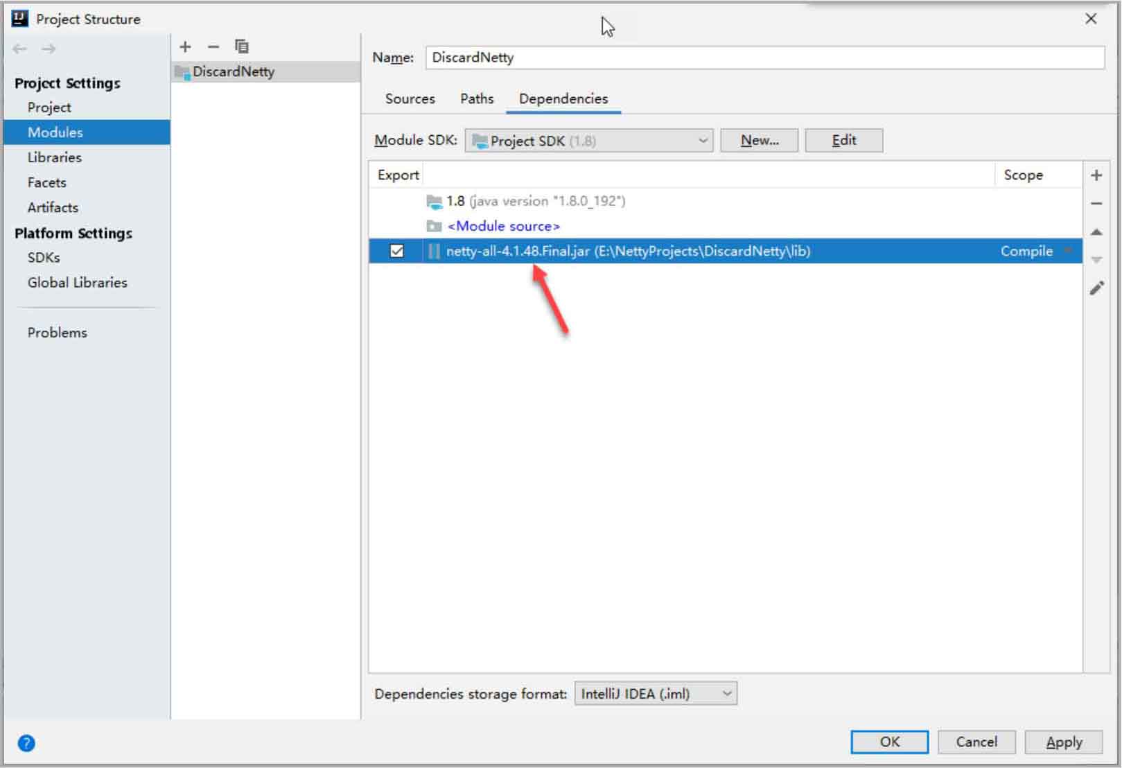 通过IntelliJ IDEA开发工具导入Netty框架的核心jar包文件,本书使用的是Netty-4.1.48版(包文件:netty-all-4.1.48.Final.jar)。