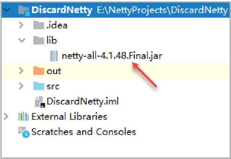 操作时,需要先在项目根目录下新建一个名称为“lib”的子目录,然后将jar包文件引入进去,具体如图2.2所示。在“lib”子目录下包含一个名称“netty-all-4.1.48.Final.jar”的jar包文件。