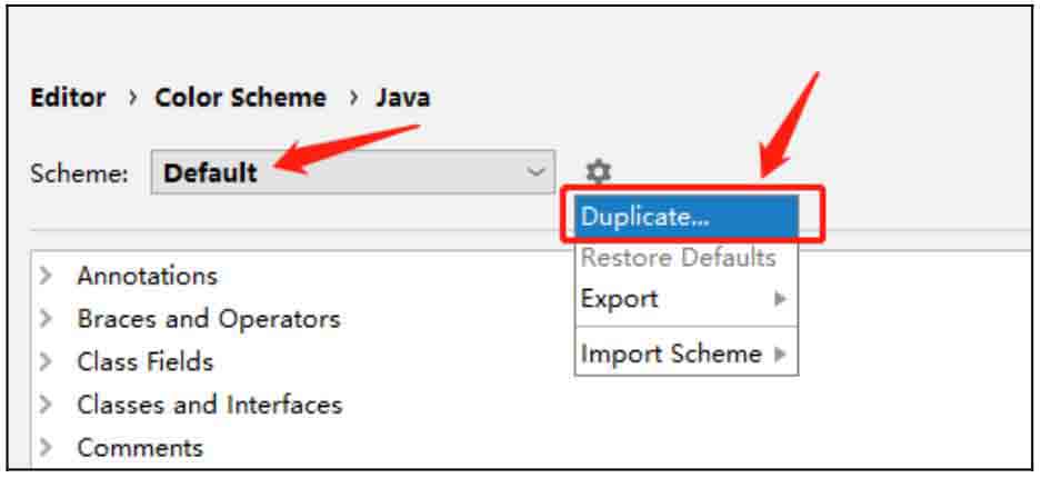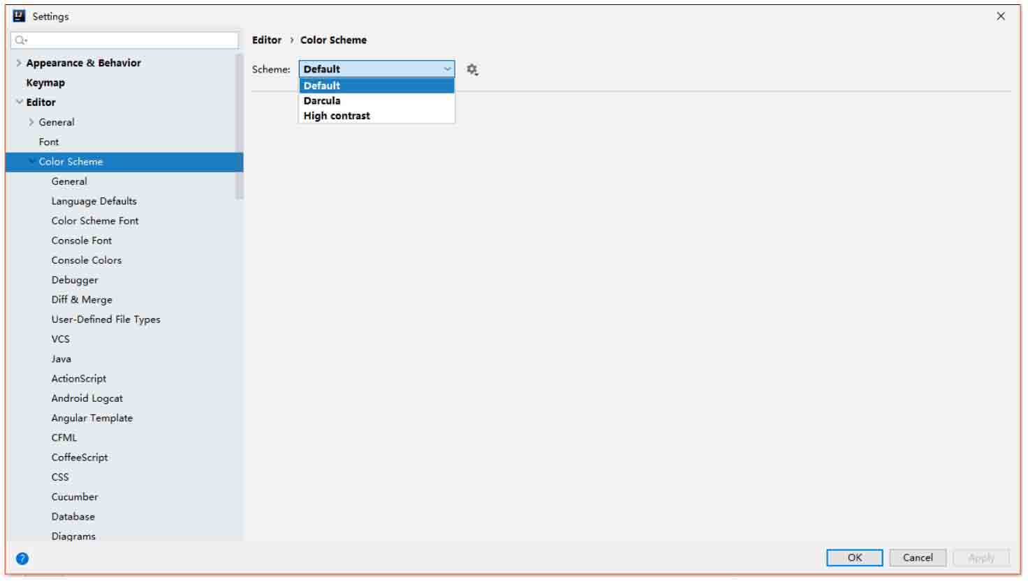 IntelliJ IDEA使用Color Scheme来定义首选的颜色和字体,包括定义窗口、对话框和控件的外观。单击File→Settings→Editor→Color Scheme,如图2-14所示。