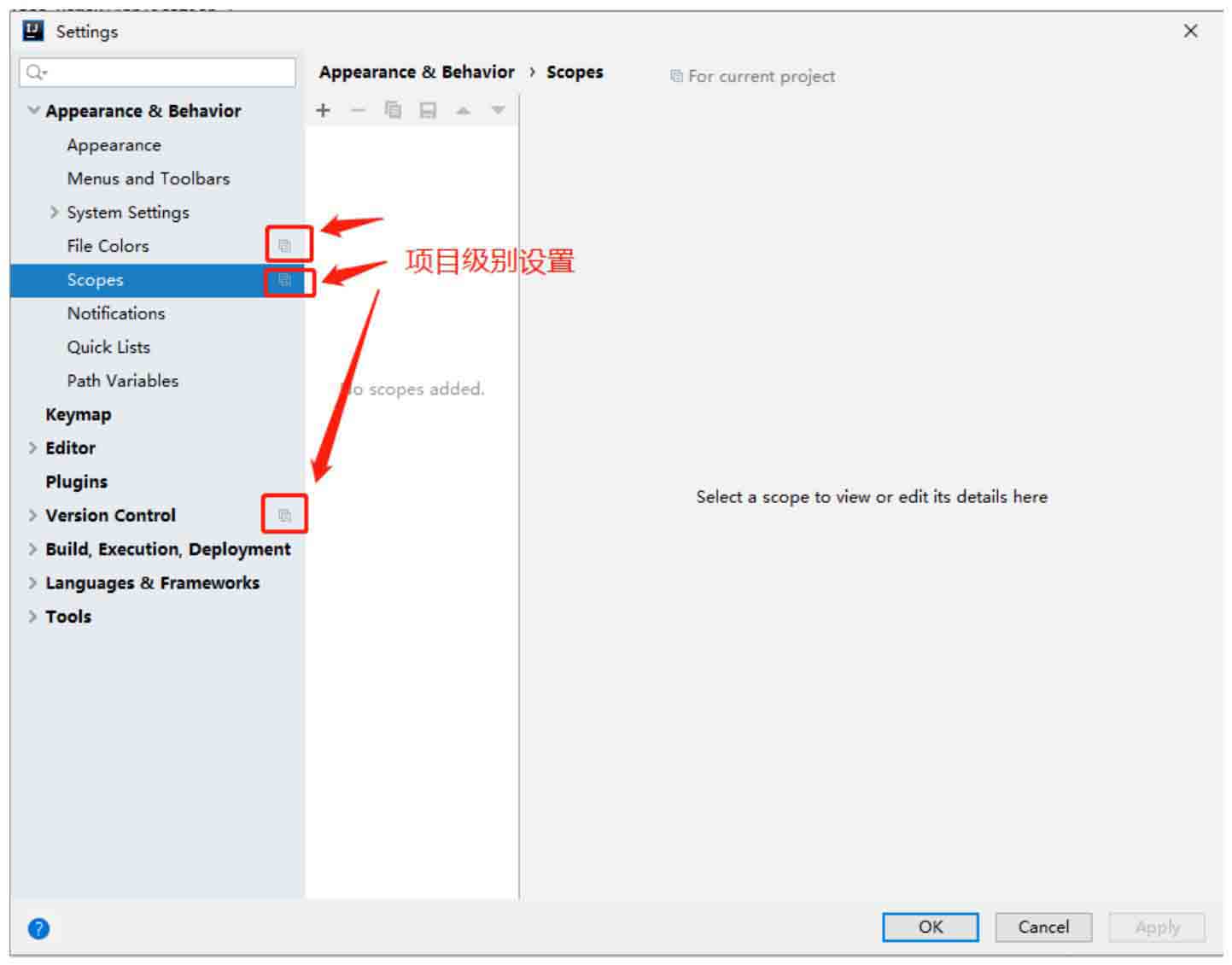 在IDE级别(全局)的设置中将应用于所有新创建的项目。IDE级别设置的列表包含较少的选项,但是它使你能够更改编辑器设置、创建自定义范围、配置检查、设置VCS特定的设置等。