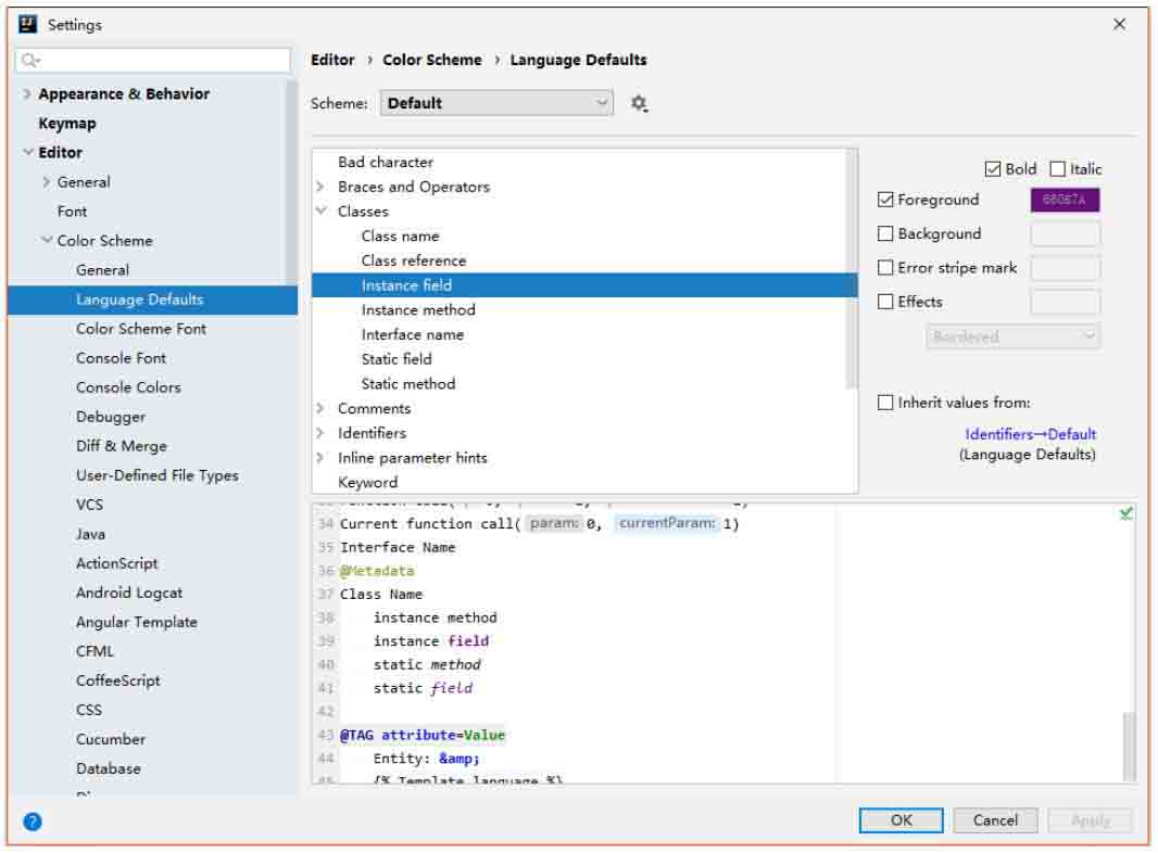 要定义颜色和字体设置,单击Editor→Color Scheme,设置分为几部分,如图2-16所示。例如,General部分定义了基本的编辑器颜色,包括装订线、行号、错误、警告、弹出窗口、提示等。Language Defaults部分包含常见的语法突出显示设置,默认情况下将其应用于所有受支持的编程语言。在大多数情况下,配置语言默认值并根据需要对特定语言进行调整就足够了。要更改元素的继承颜色设置,去掉Inherit values from复选框的勾选即可。