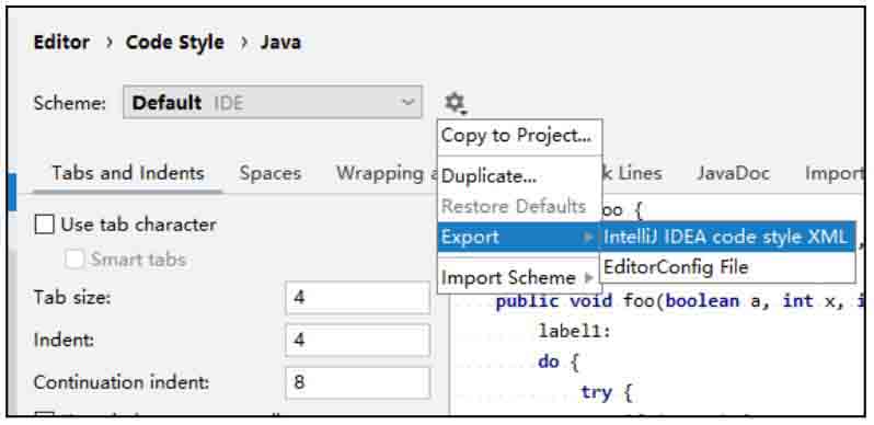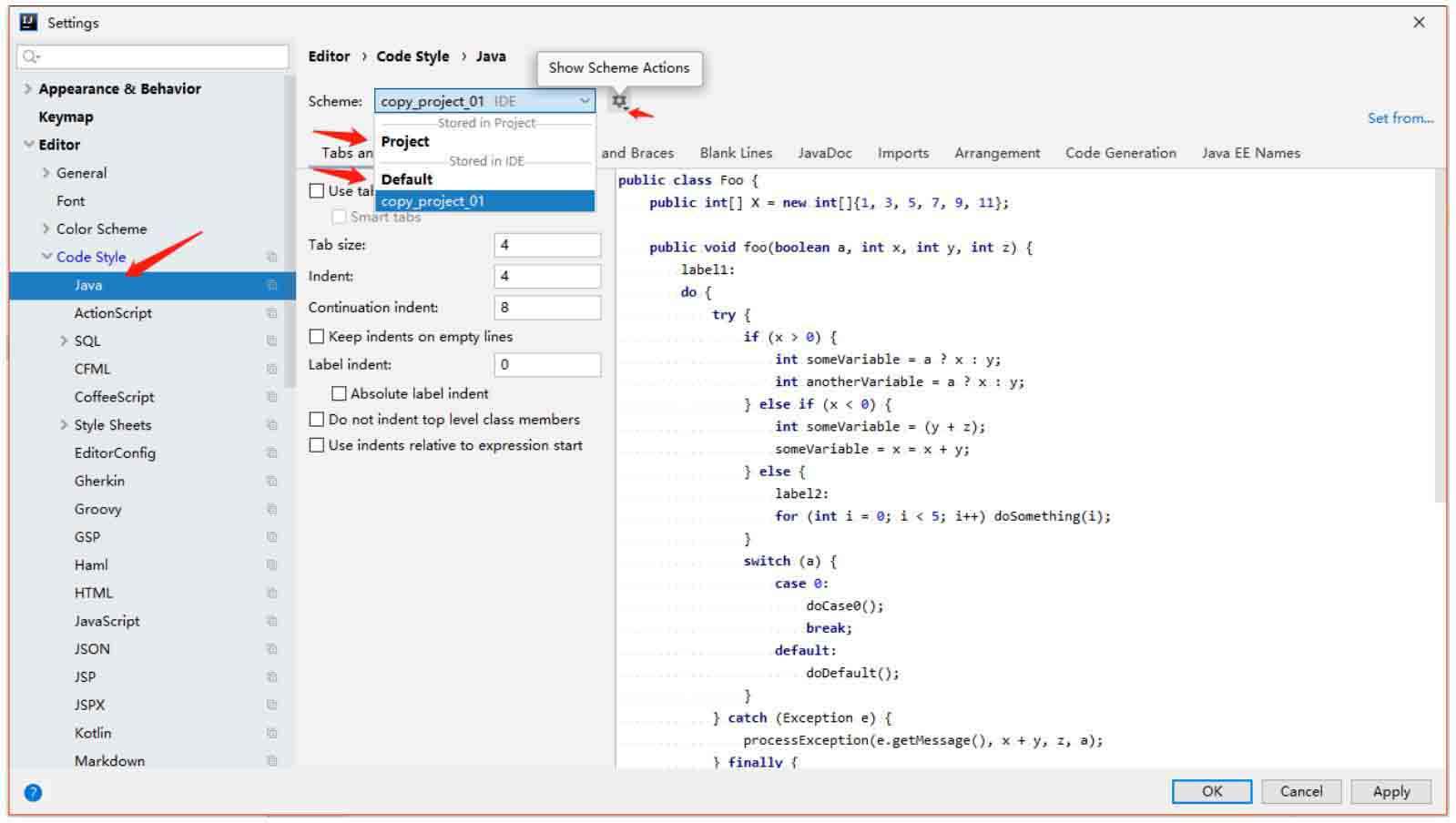 在IDE级别,将设置分为预定义的“默认”方案(以粗体标记)和用户通过“复制”命令创建的任何其他方案。当用户不想在项目中保留代码样式设置并共享它们时,将使用全局设置。可以使用Copy to Project将IDE方案复制到当前项目。