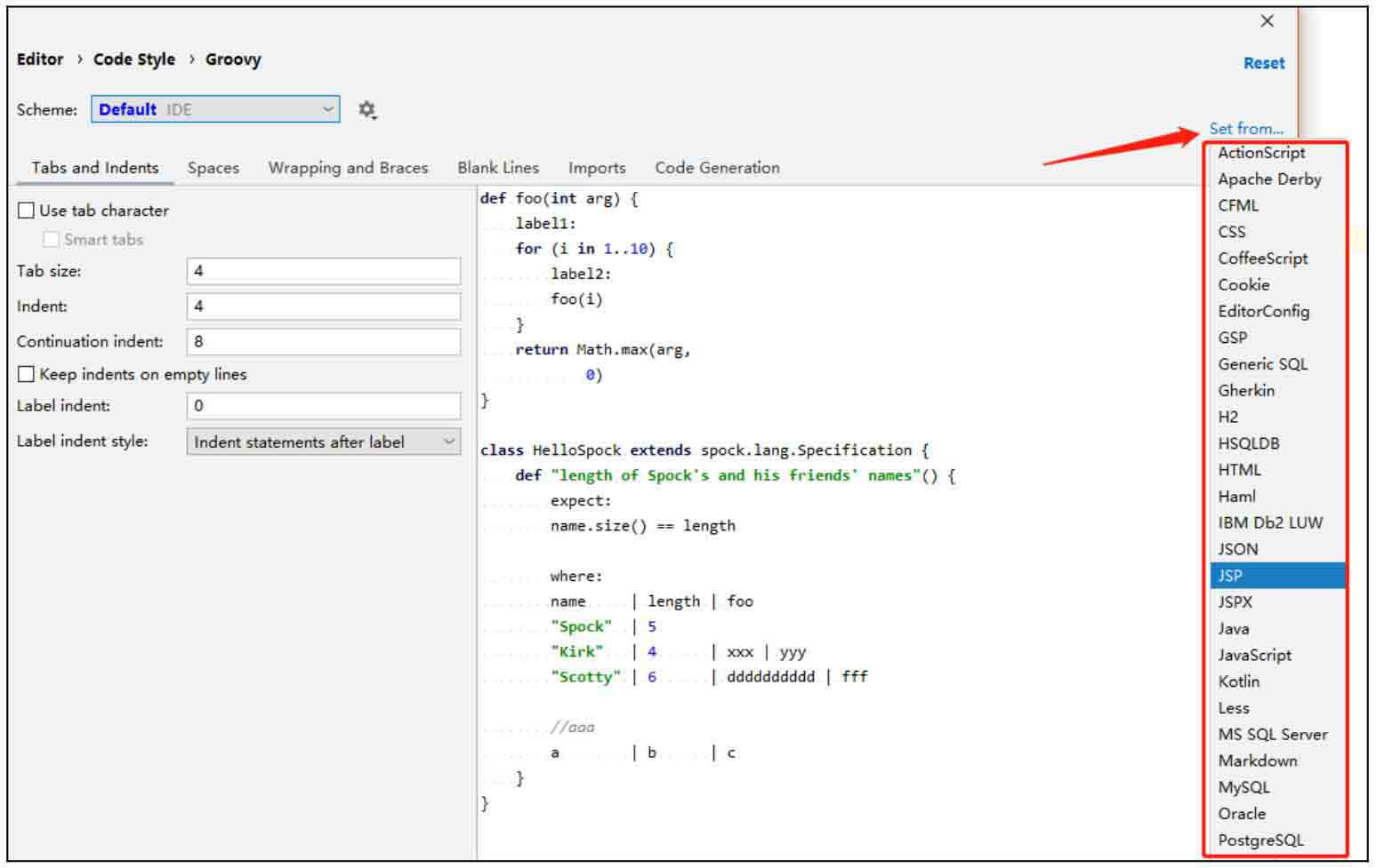 对于大多数受支持的语言,还可以从其他语言或框架复制代码样式设置。比如将Java语言的代码样式复制到Groovy语言中使用等。除此之外,还可以使用Set from链接,选择“预定义”,然后选择相关的预配置标准,如图2-13所示。