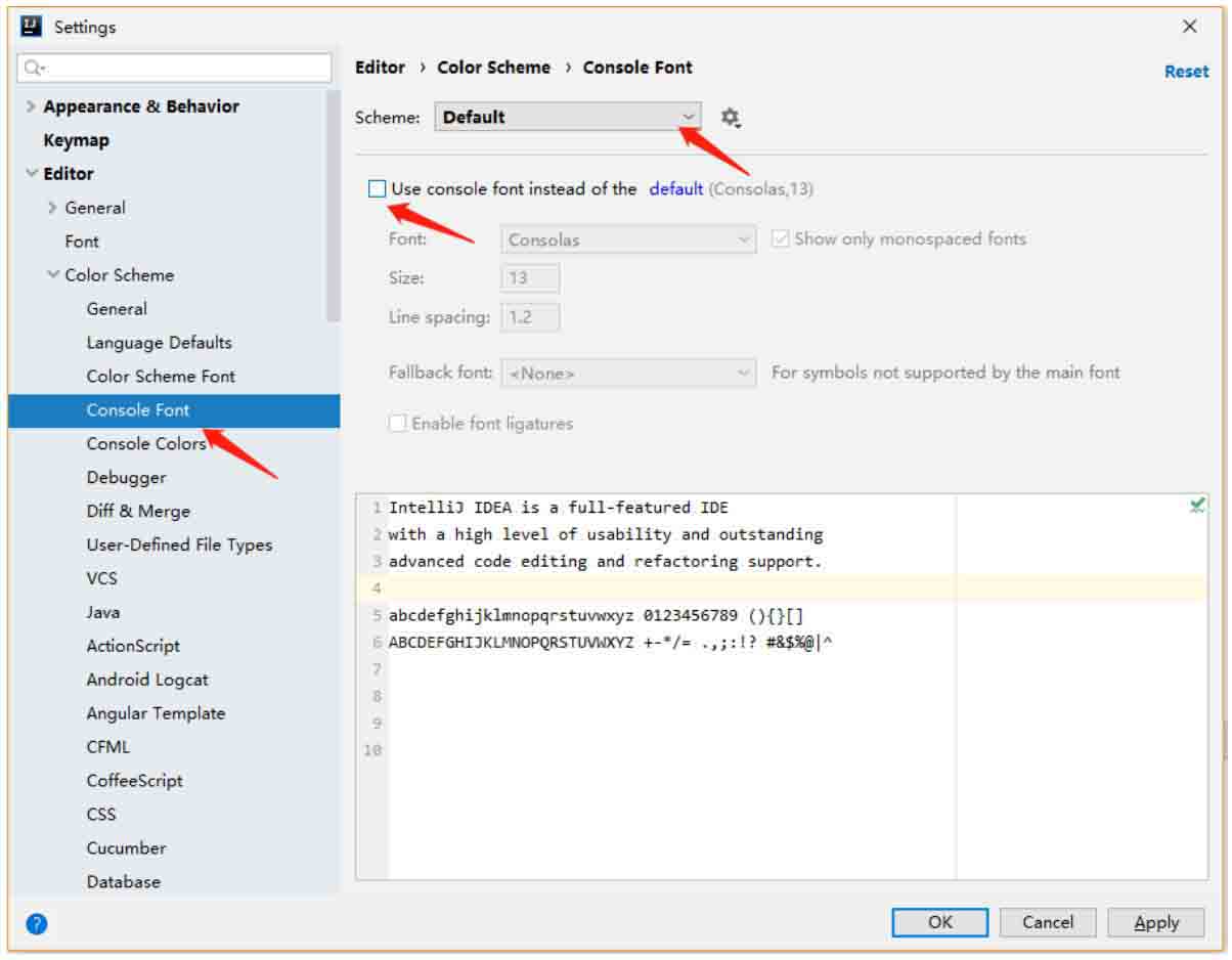 可以使用Default默认字体配置,也可以使用其他的字体配置,选择Use console font instead of the default进行更加细致的配置,配置完成后,单击Apply应用配置便可以在控制台中查看配置效果。