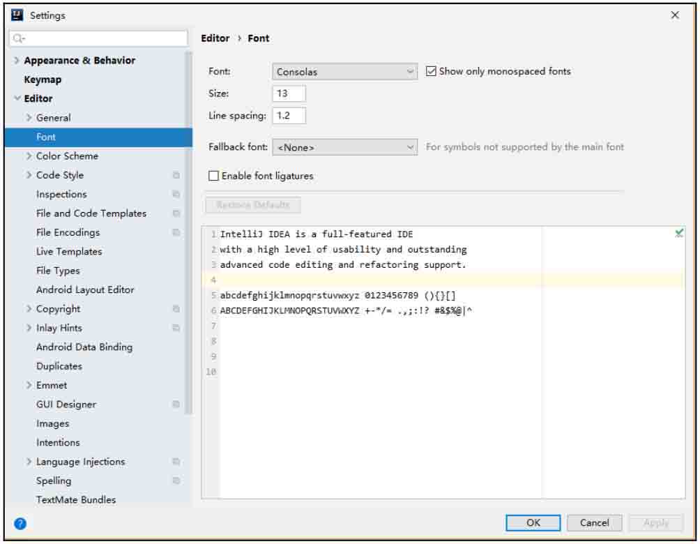 要自定义默认字体,单击File→Settings→Editor→Font,如图2-17所示。