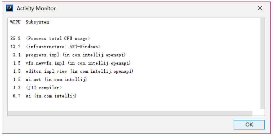活动监视器是IntelliJ IDEA中的一项实验功能,如果出现性能问题,可以使用Activity Monitor(活动监视器)来跟踪各种子系统和插件消耗的CPU百分比。