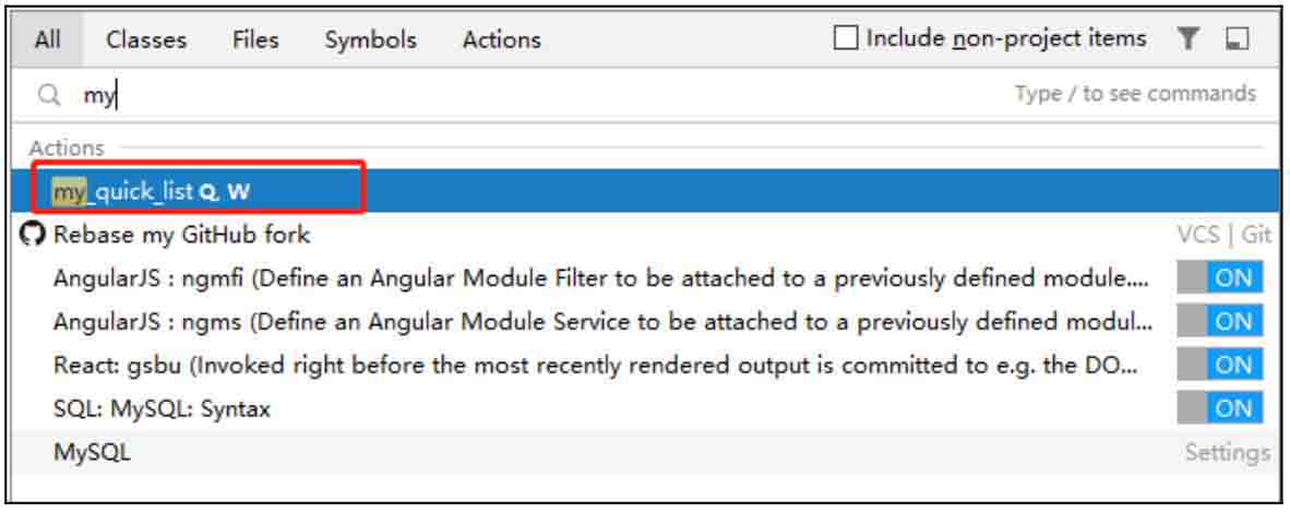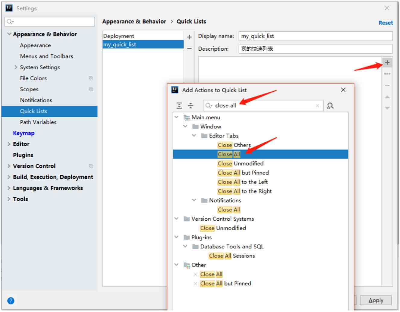 一个快速列表(quick list)是包含IntelliJ IDEA行为的自定义设置,并通过绑定快捷键来访问。可以根据需要创建任意多个快速列表。