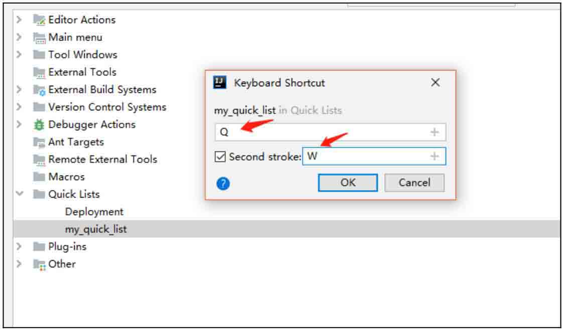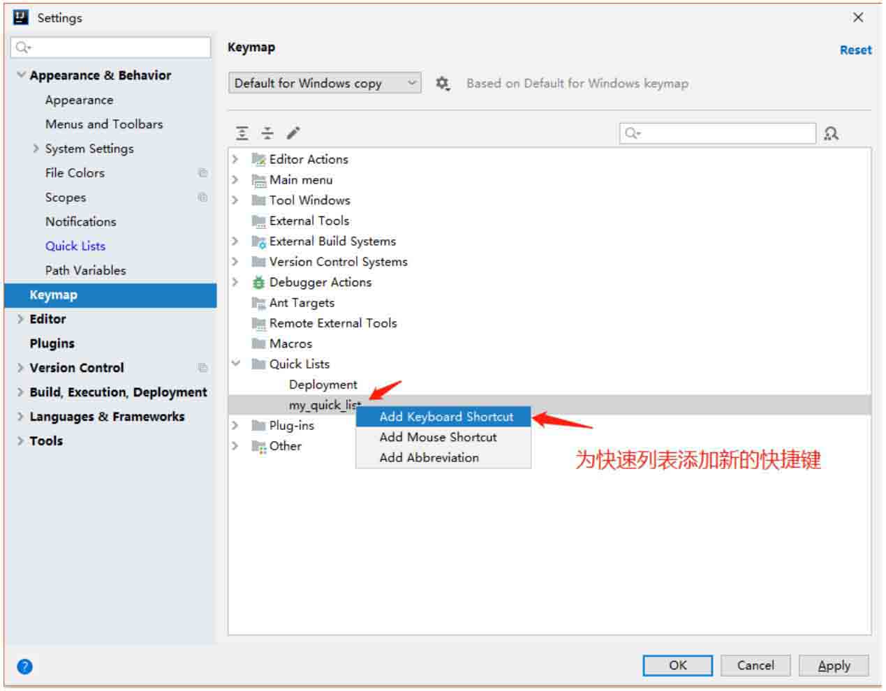 将新的快速列表绑定到快捷方式,单击File→Settings→Appearance & Behavior→Keymap,展开Quick Lists节点,然后选择新的快速列表。添加键盘快捷方式并保存更改,如图2-26和图2-27所示。