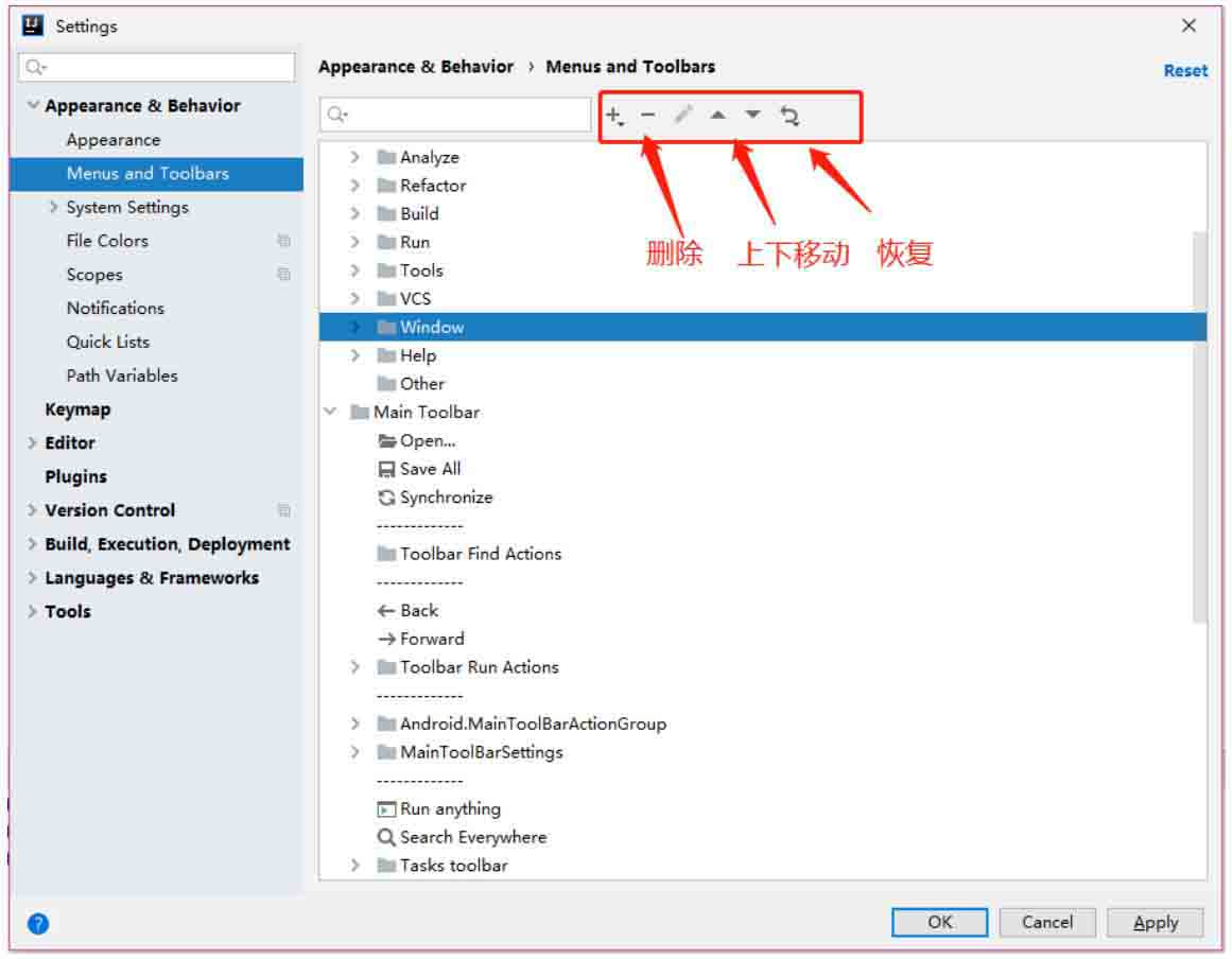 单击File→Settings→Appearance & Behavior→Menus and Toolbars,打开对话框,如图2-23所示。