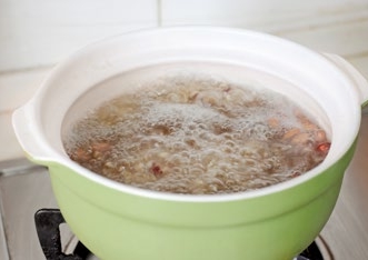 锅里加足量清水烧开,倒入浸泡好的红豆、高粱、糯米、洗净的花生。