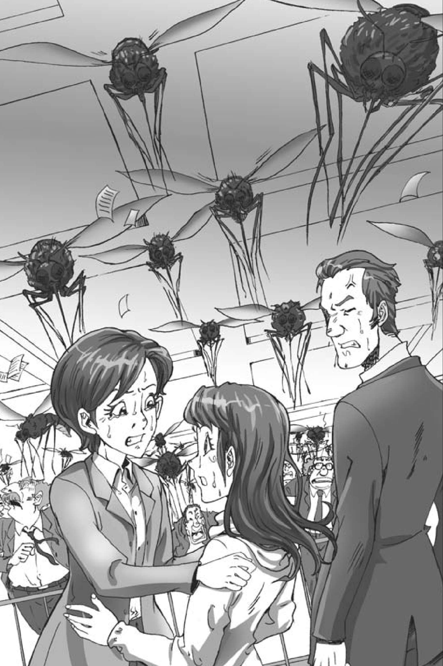 女孩回过头去,惊恐地看见,无数飞行着的黑色怪物正像决堤的洪水一般,从大门冲了进来。怪物像小牛犊一样大,身体和脚都很长,半球形的头部长着苍蝇似的复眼和棍棒似的触角,一根长长的、像剑一样锋利的喙盛气凌人地朝前伸着,身体分头、胸、腹三截,身上覆盖着盔甲般的鳞片,一对如钢片般坚硬的翅膀飞快地振动着。这可怕的轰鸣声,正是它们振翅时发出来的。它们在半空中盘旋,好似一架架小型的战斗机!