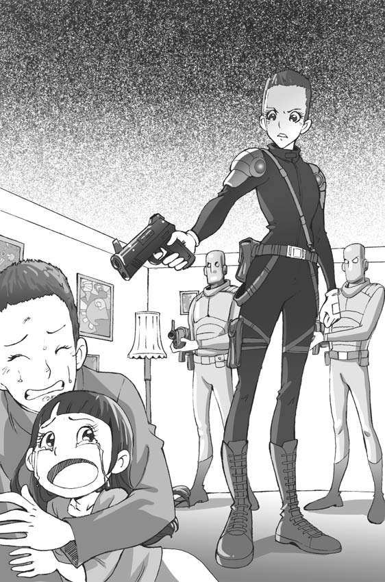 年轻的妈妈原以为,她能通过这间温馨的房间,为女儿创造一个和过去时代一样的,温馨、浪漫的生活环境。但是,事与愿违,只听砰的一声巨响,反锁的门被人从外面重重地踢开了,沉重的门板轰然倒下。一个身穿黑色紧身衣、手持冷冻手枪的少女,带着六个同样手持枪械的机器人冲了进来。