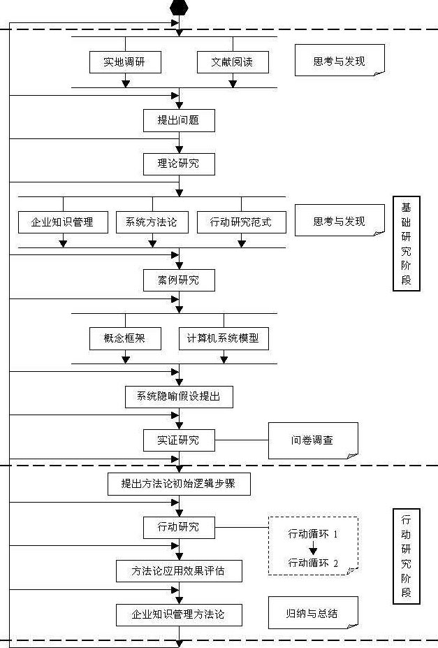 在选题确定之后,接下来的工作就是要从理论上寻找本书立论的依据。为此,我们对企业知识管理及其方法论、系统方法论的新进展以及行动研究范式等三方面的理论文献进行了系统研究和思考,达到了三个方面的目的:一是发现了现有企业知识管理概念框架及其方法论存在的缺陷;二是找到了全面系统干预元方法论和利益协调软系统方法论作为指导和构建企业知识管理方法论的基础理论;三是初步明确了行动研究范式中的McKernan模式可以作为我们检验企业知识管理方法论逻辑步骤的主要方法。
