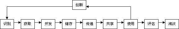 根据上述三种知识演化模式的探讨,我们可以总结出一条知识演化的路径,它应该包含如图2-4所示的识别、获取、开发、储存、传递、共享、使用、创新、评估和淘汰等十个步骤,其中蕴涵了知识螺旋的四个演化过程,使得知识的演化过程生生不息 [74] 。