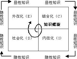 Nonaka和Konno的主要贡献之一就是对隐性知识和显性知识之间相互转化模型的描述。这个模型概括了知识之间的四种转化过程(包括Socialization、Externalization、Combination和Internalization,简称为SECI过程),它们是:(1)隐性知识转化为显性知识,称为知识的外在化(或编码化),主要通过对人脑中存在的隐性知识进行归纳、总结并以编码的方式表现出来;(2)显性知识转化为显性知识(知识扩散),称为知识的组合化,主要是对现存的显性知识通过组合形成新的显性知识;(3)显性知识转化为隐性知识,称为知识的内在化,主要通过人在工作中运用显性知识的体验来形成;(4)隐性知识转化为隐性知识(知识增值),称为知识的社会化,主要通过企业文化氛围和有效的知识传递环境来实现 [71] 。