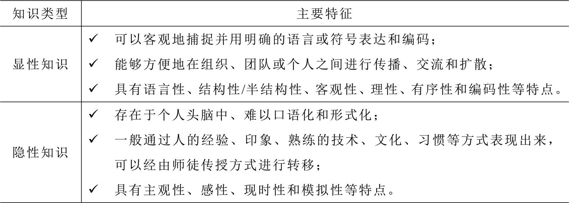 通过对有关文献的阅读,结合本书的实际需要,笔者将显性知识与隐性知识的特征归纳为表2-3所示。