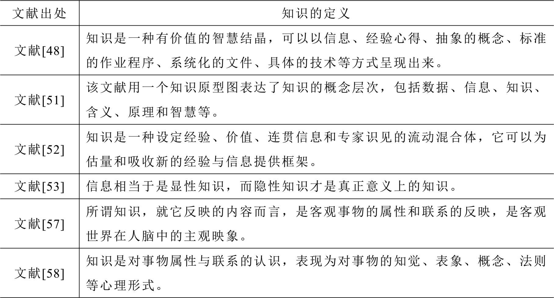 此外,图2-1清晰地表现了数据、信息(显性知识)、知识和智慧之间的关系。在知识管理理论界,上面所描述的知识是一个重要的基本概念,但是,在大多数的知识管理理论中,所谓知识涵盖了图中的信息和知识两个层面,而本书所采用的知识定义亦是这种广义的知识。