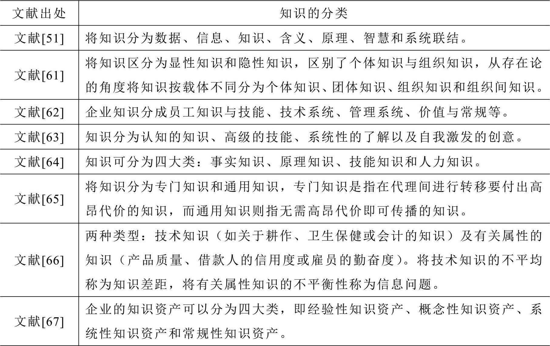 关于知识的定义和分类,有许多学者都进行过探讨,例如文献[47]~[67]对知识的定义和分类从不同领域和角度进行了论述。我们通过表2-1和表2-2对以上文献中的有关论述进行比较。