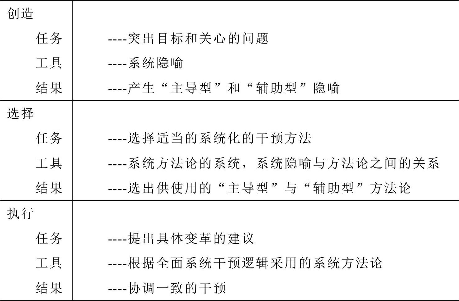 创造阶段的任务是用系统隐喻来组织思想,帮助管理人员对他们的企业进行创造性的思考。选择阶段的任务是选择与创造阶段结论相匹配的系统干预方法。执行阶段的任务是运用特定的系统方法论,研究组织中的问题,提出改进的建议,进行协调一致的干预 [115] 。