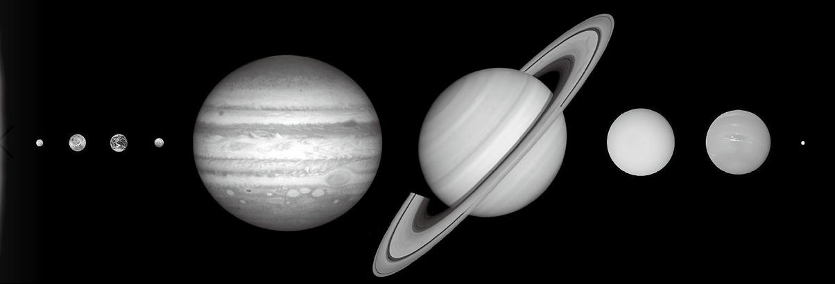 太阳系各行星体积比例,从左到右依次为水星、金星、地球、火星、木星、土星、天王星与海王星。