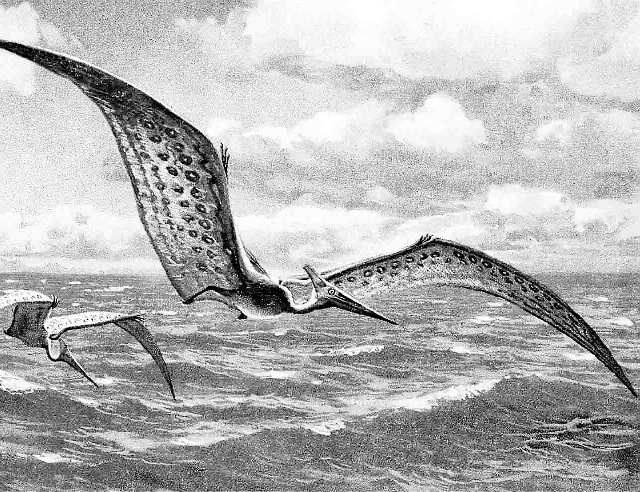 当这些大型动物在中生代丛林的蕨叶和常绿植物间寻觅食物、彼此追逐时,另一种现已灭绝的爬行动物,却在用那蝙蝠翅膀般的前肢追捕着昆虫。起初,它们只能笨拙地跳跃,到后来则能在树木之间急速地滑翔了。这,就是翼手龙。翼手龙是最早学会飞行的脊椎动物,在脊椎动物发展史上开创了一个新纪元。