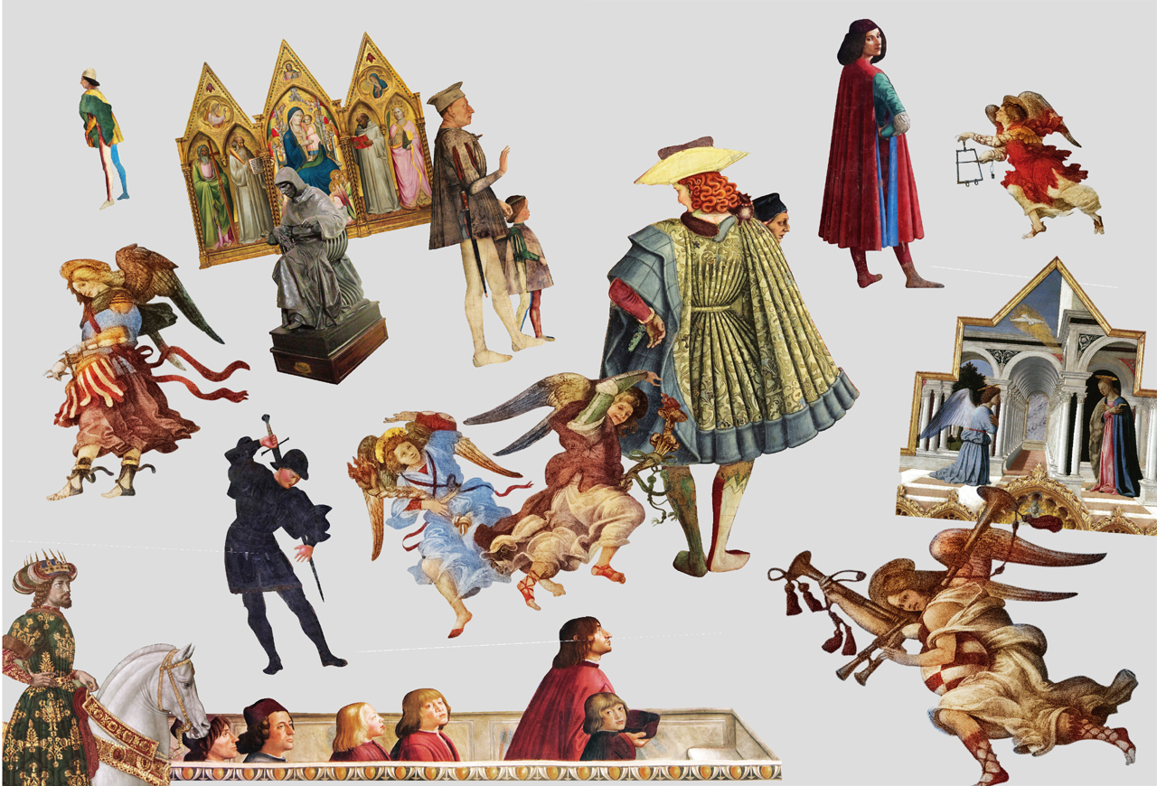 但我一激灵:重点讲述了弗朗切斯卡的伟大布局,我忘了交代这位沉着的大师如何处理“时间”。赶紧问导演能否添加。回复是:“好啊,快写!明天还有两小时让拍。”翌日上午我穿戴好,爬上梯子,补录了以下段落: