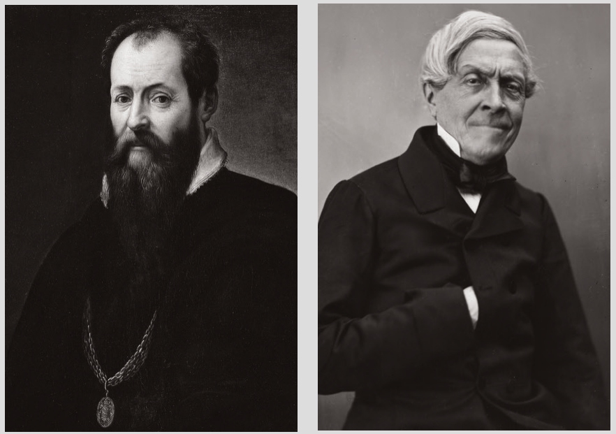 左:乔尔乔·瓦萨里(1511—1574年)。右:儒勒·米什莱(1798—1874年)。今日有关文艺复兴的论述、考据、研究,肇始于瓦萨里及他的著作《艺苑名人传》,为欧洲所谓“美术史”学科的先驱。而“文艺复兴”一词,出自这位19世纪的历史学家儒勒·米什莱。