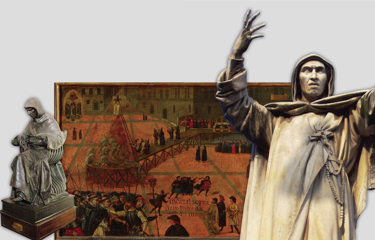 两侧为萨伏那洛拉雕像:左边的位于圣马可修道院前,右边的位于费拉拉的埃斯特城堡附近,那是他出生与修行之地。