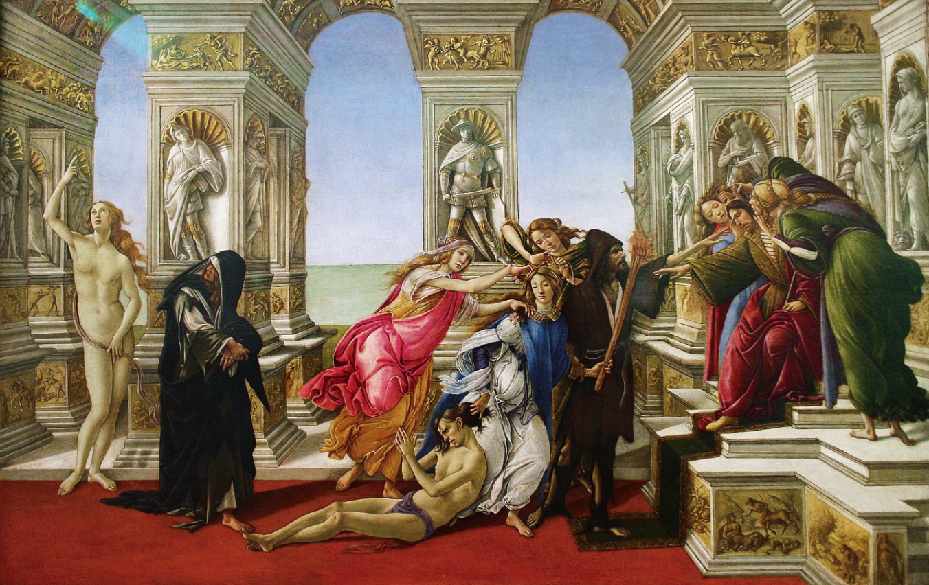波提切利,《阿佩莱斯的谗言》,1494—1495年,佛罗伦萨乌菲兹美术馆收藏。