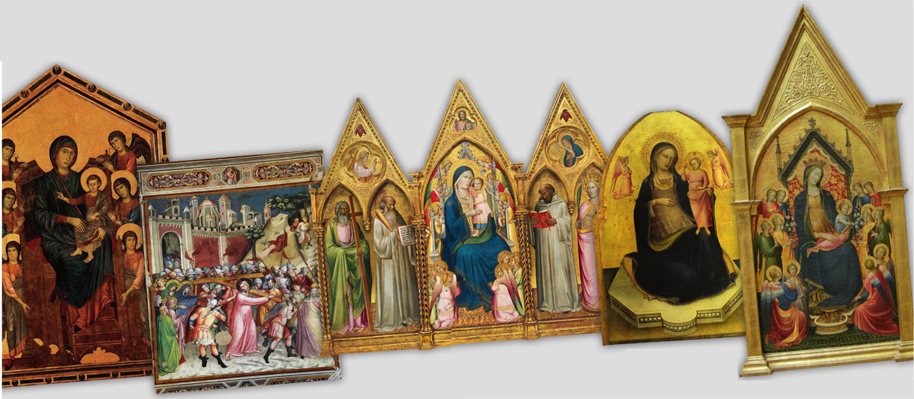 自左至右:契马布埃,《圣母子》,约1285年。塔德奥·加迪,《耶稣背十字架》(《耶稣受难》局部),1328—1338年。