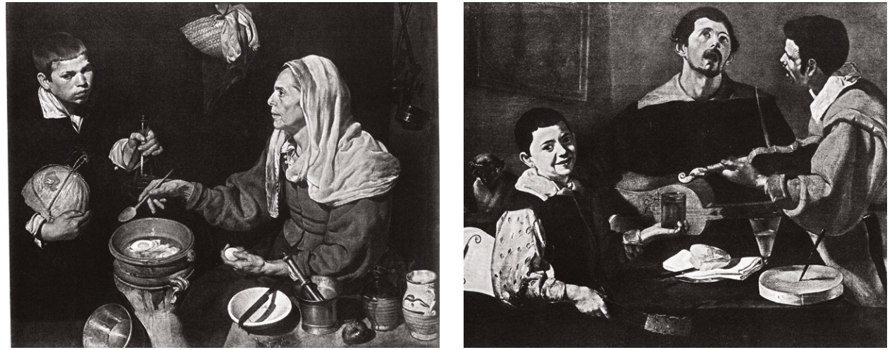 委拉斯开兹早期作品,左:《煎鸡蛋的老妇》,1618年,现藏于苏格兰国立美术馆;右:《三个音乐家》,1618年,现藏于德国柏林名画陈列馆。