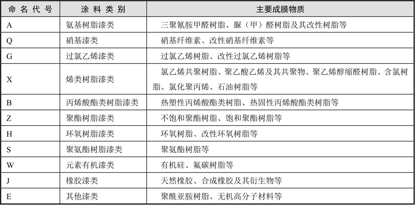 GB/T 2705给出两种涂料的分类方法,第一种以产品用途为主线进行划分,主要包括建筑涂料、工业涂料、通用涂料及辅助涂料;第二种以主要成膜物为主线进行划分,包括建筑涂料、其他涂料及辅助涂料。对电子装备防护涂料而言,以成膜物种类进行分类比较合理,如表2-1所示。