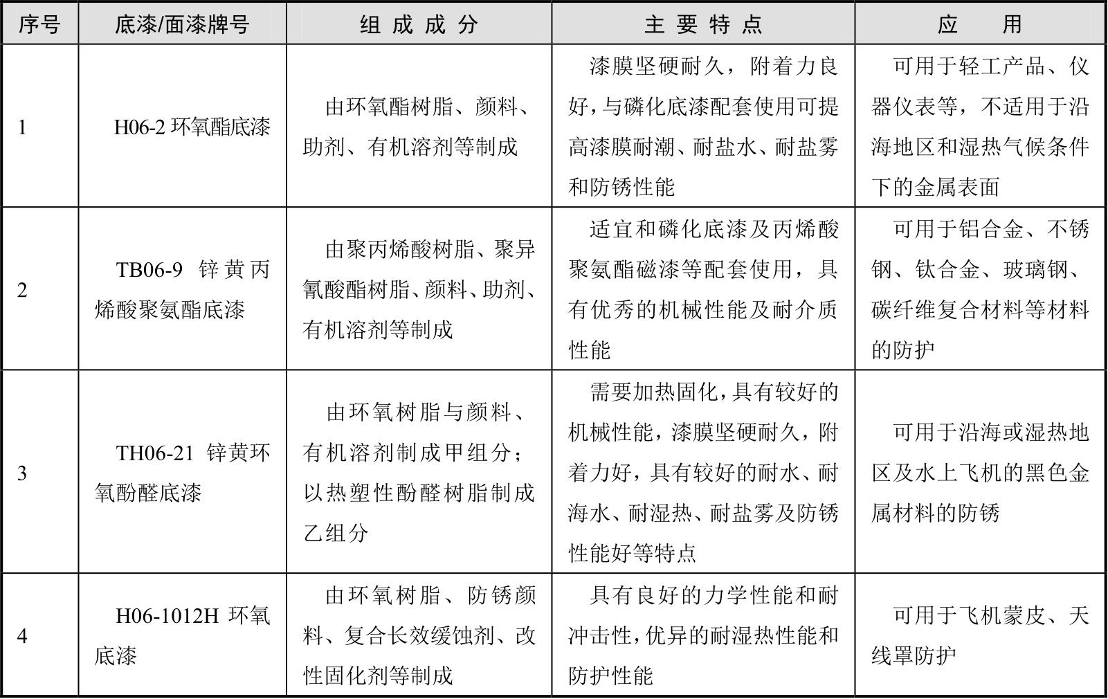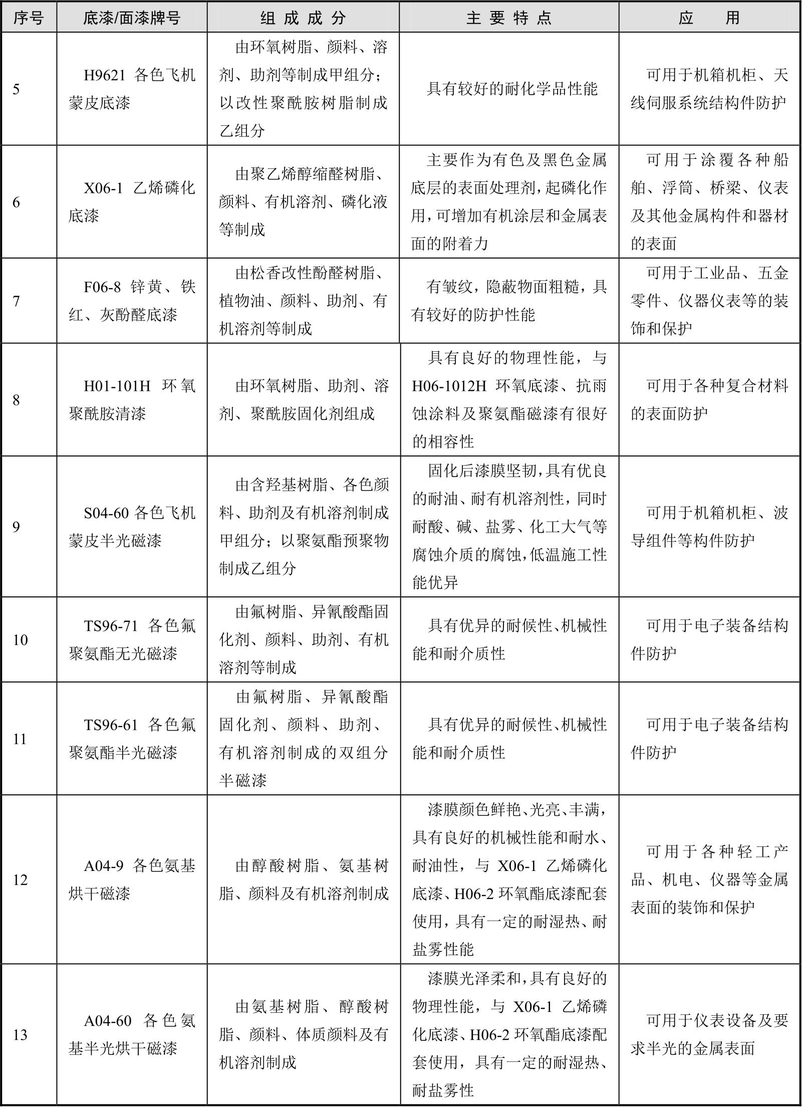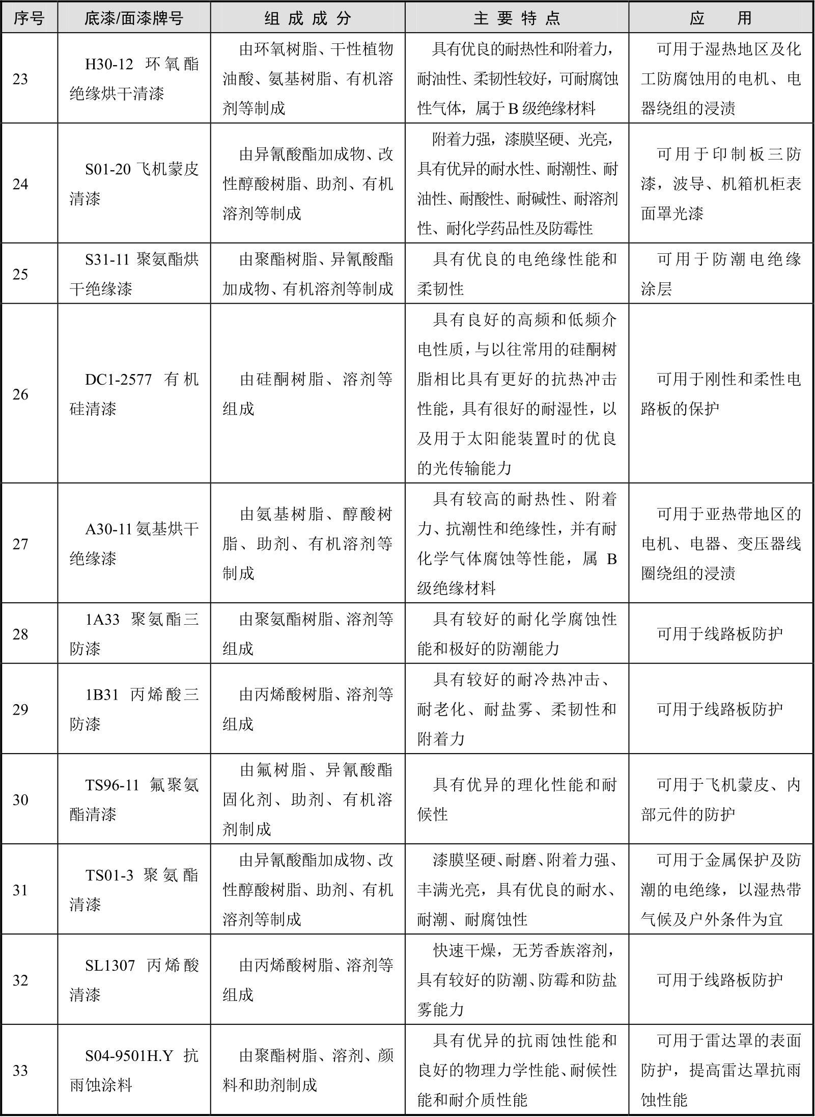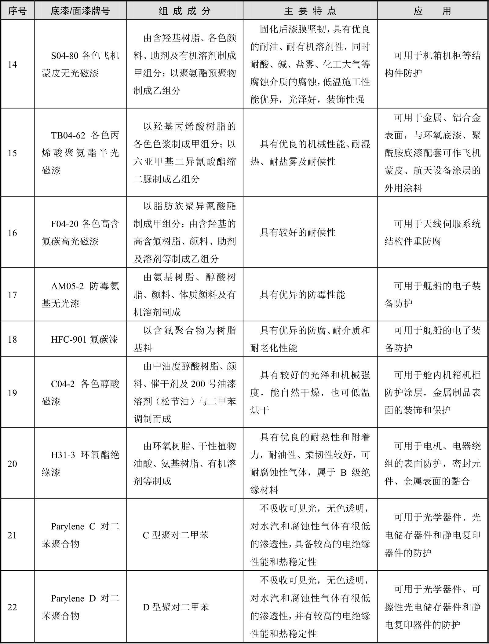 工业和信息化部电子第五研究所调研获得的目前国内电子装备应用的部分防护涂料信息(见表2-2),与表2-1对照,可见大多数种类涂料在电子装备上均有所应用。