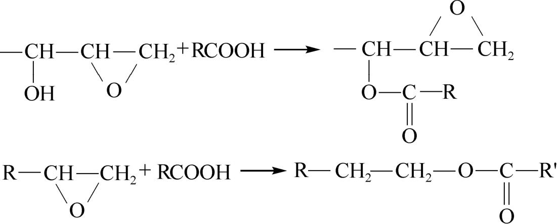 环氧树脂与—COOH反应,羧酸类作为固化剂,羟基可与羧基酯化,环氧基可与羧基加成固化,从而形成环氧酯型涂料,其反应如下: