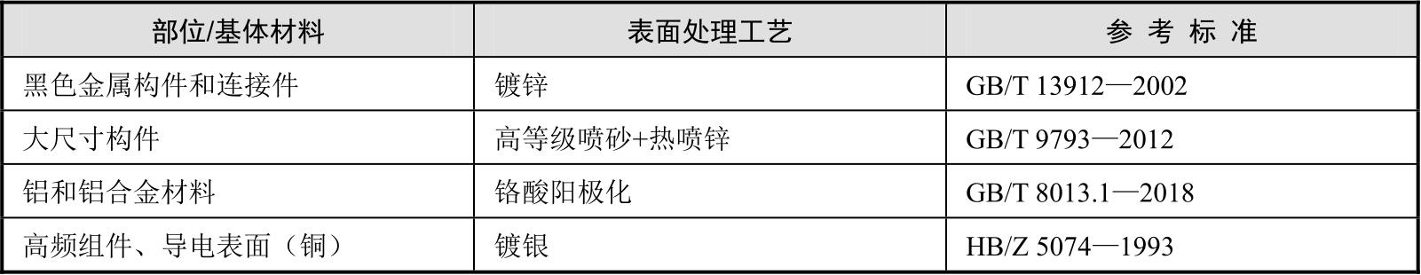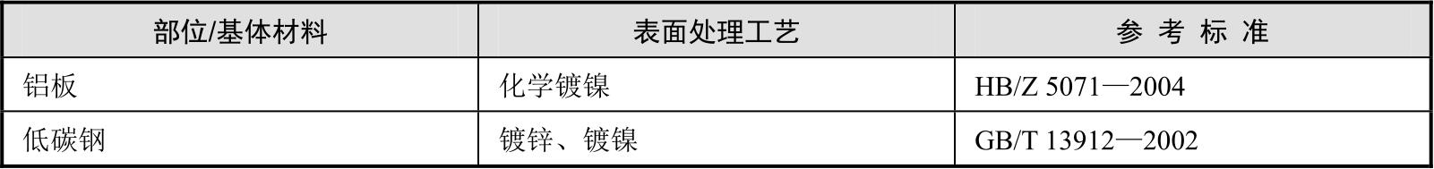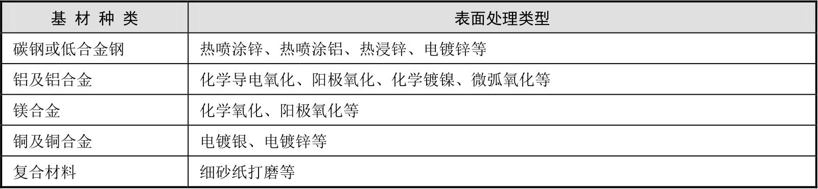 电子装备基材种类包括:碳钢或低合金钢、铝及铝合金、镁合金、铜及铜合金、复合材料等。表面处理类型根据基材种类的不同有所区别,电子装备主要表面处理类型如表2-3所示。