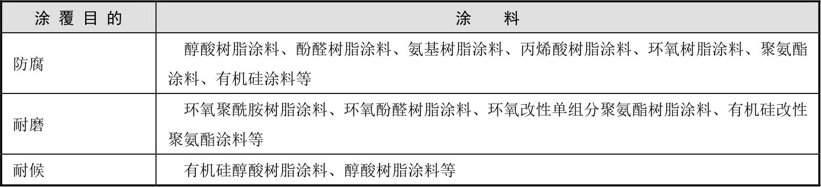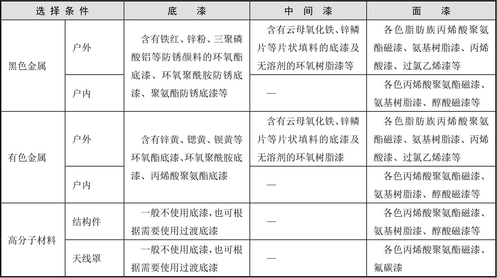 结合使用环境特点和防护涂层性能要求,可给出推荐选用的涂料种类,如GB/T 20644.1给出高原、干热、干热沙漠中金属表面常用涂料,如表2-5所示。