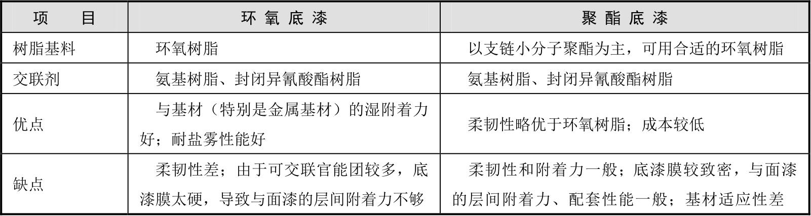 表2-14 环氧底漆与聚酯底漆特性对比