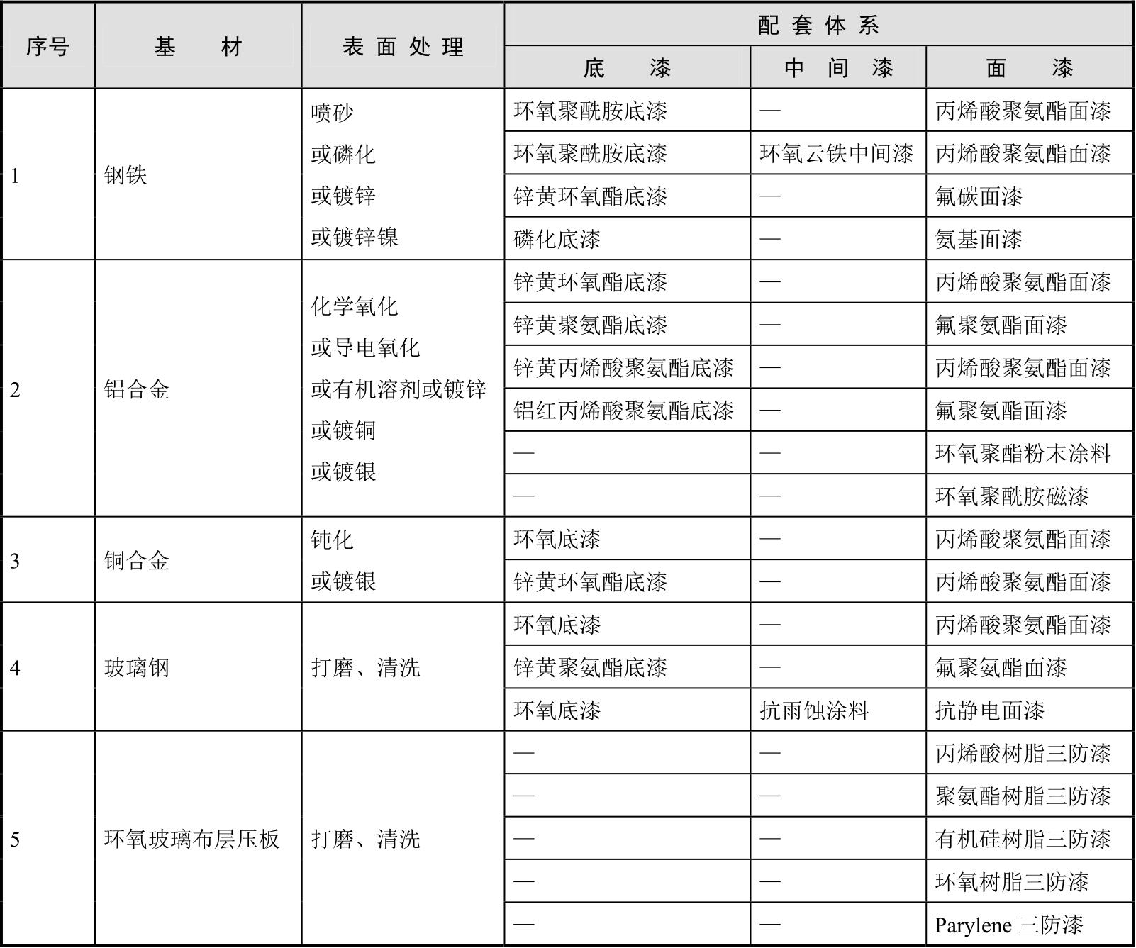 目前国内部分标准给出典型的防护涂层配套方式,在防护设计中可参照选用。SJ 20890《电子装备的处理和涂装》根据常用基材类型和应用环境,给出推荐的防护涂层配套体系,如表2-17所示。