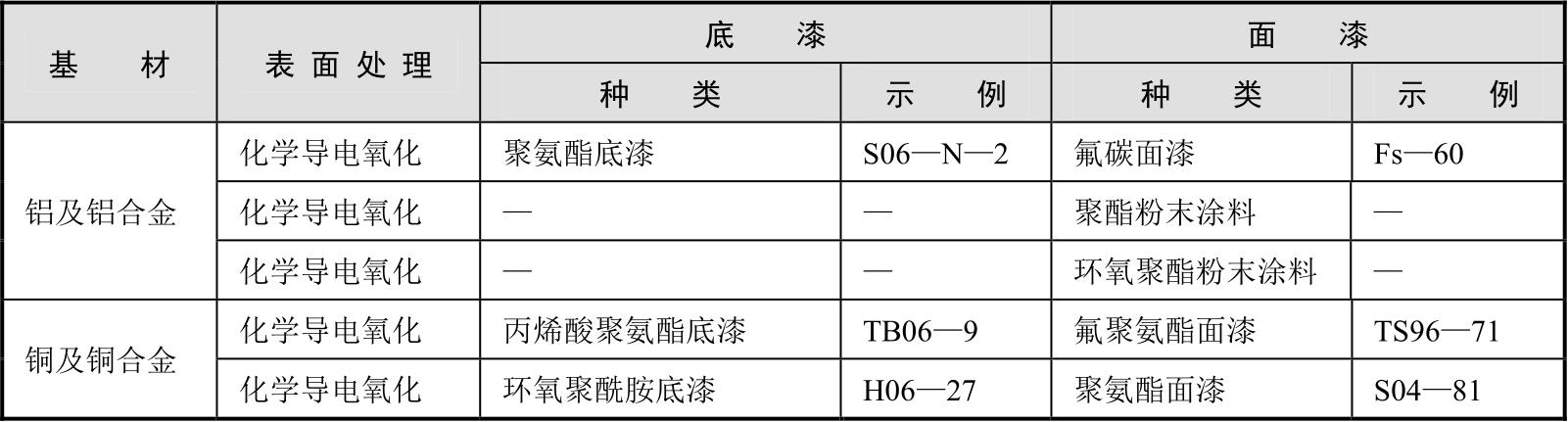 底漆选用与基材或表面改性层种类密切相关,不同金属适用的底漆类型如表2-15所示。