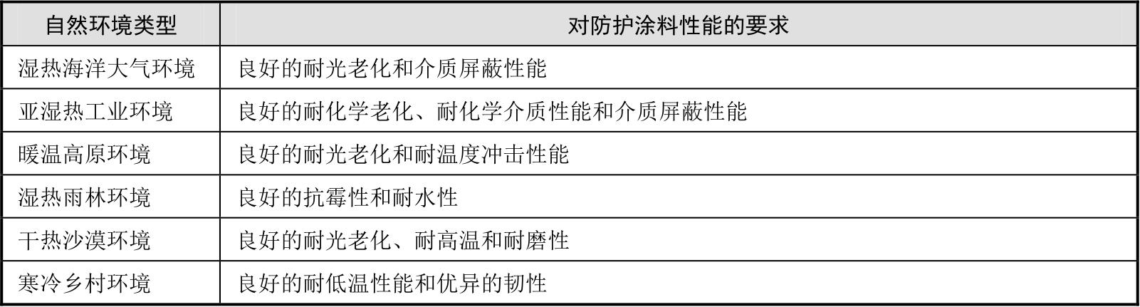 表2-4 国内典型自然环境类型对防护涂料性能的要求