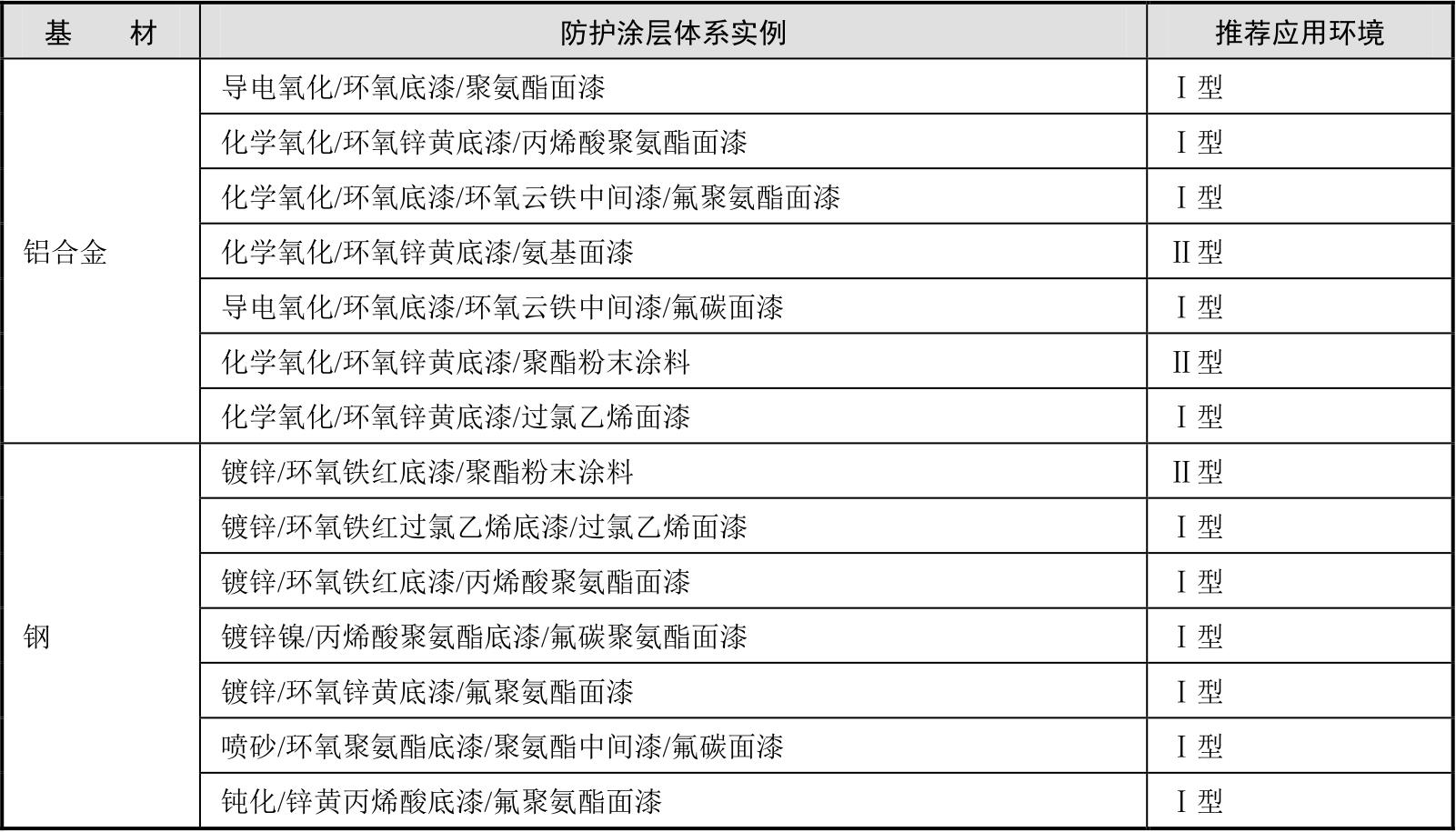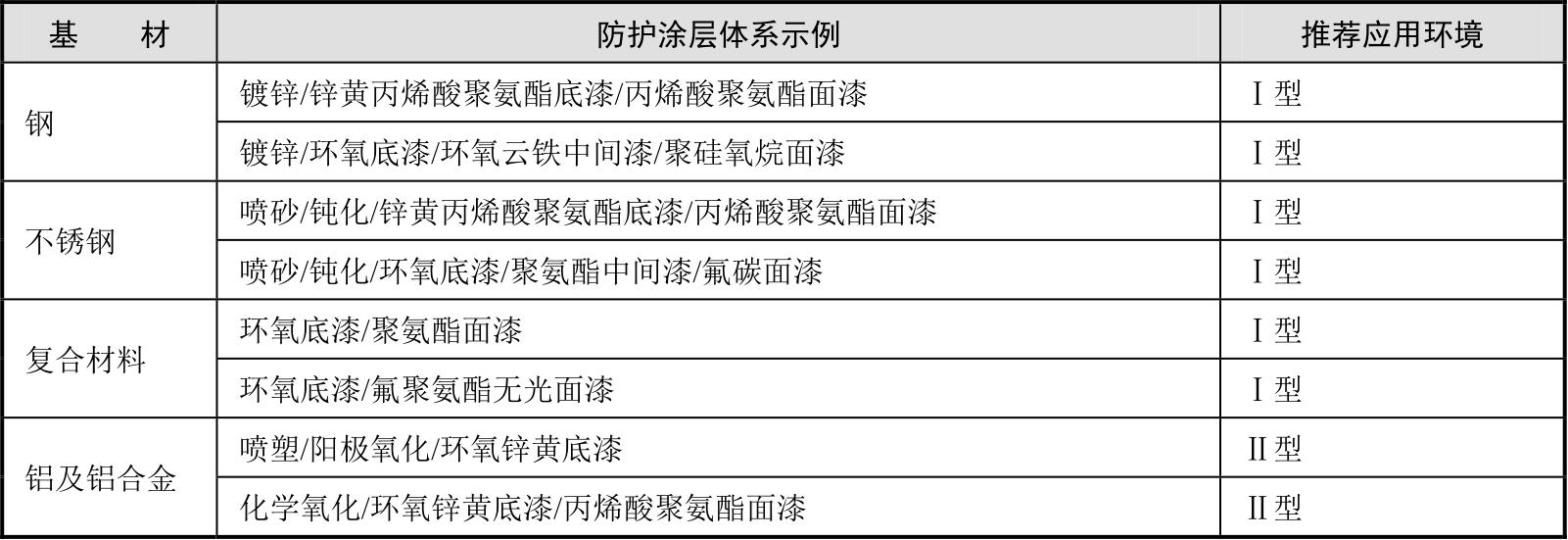 ISO 12944—5《色漆和清漆—防护涂料体系对钢结构的防腐蚀保护 第5部分:防护涂料体系》根据不同基材、应用环境和耐久性要求,给出推荐的防护涂层体系,经过实践证明,可指导产品设计人员优选防护涂层体系。